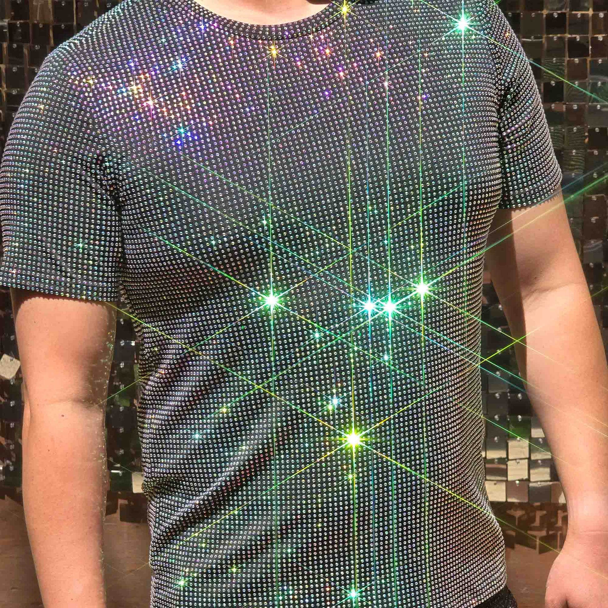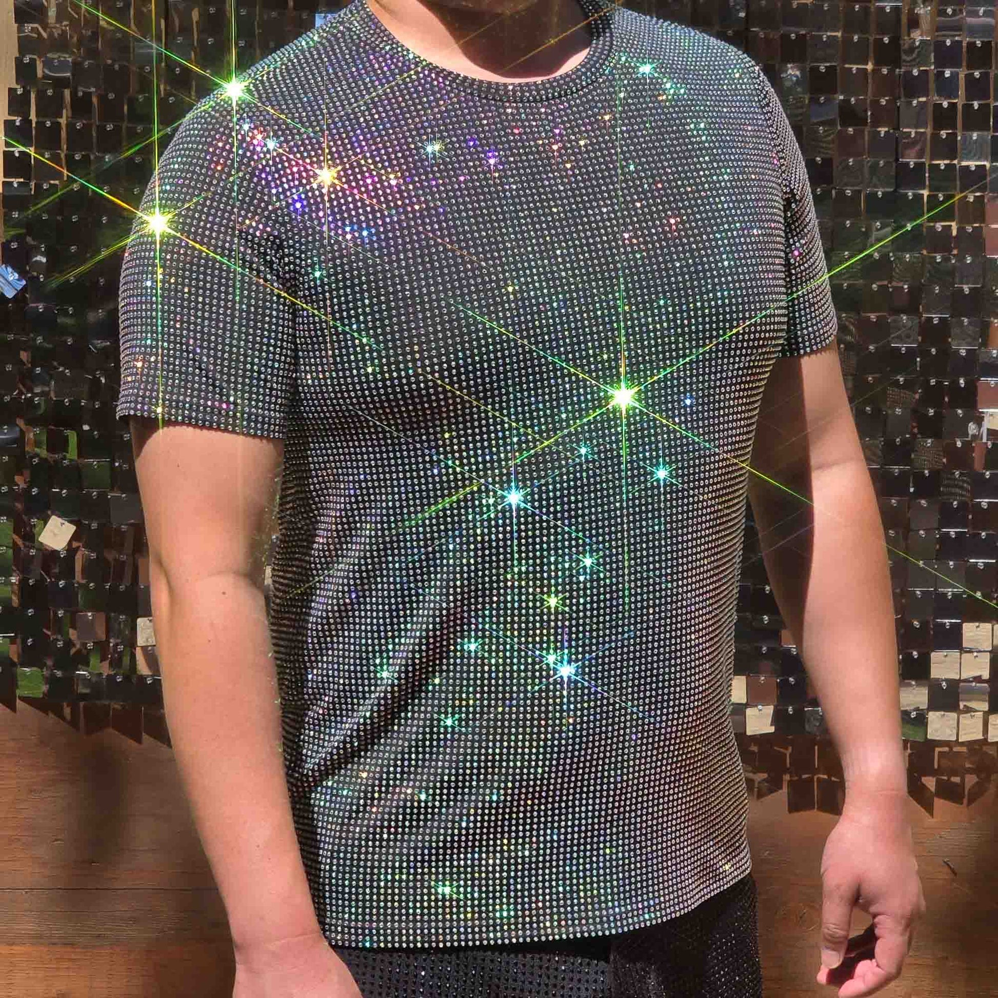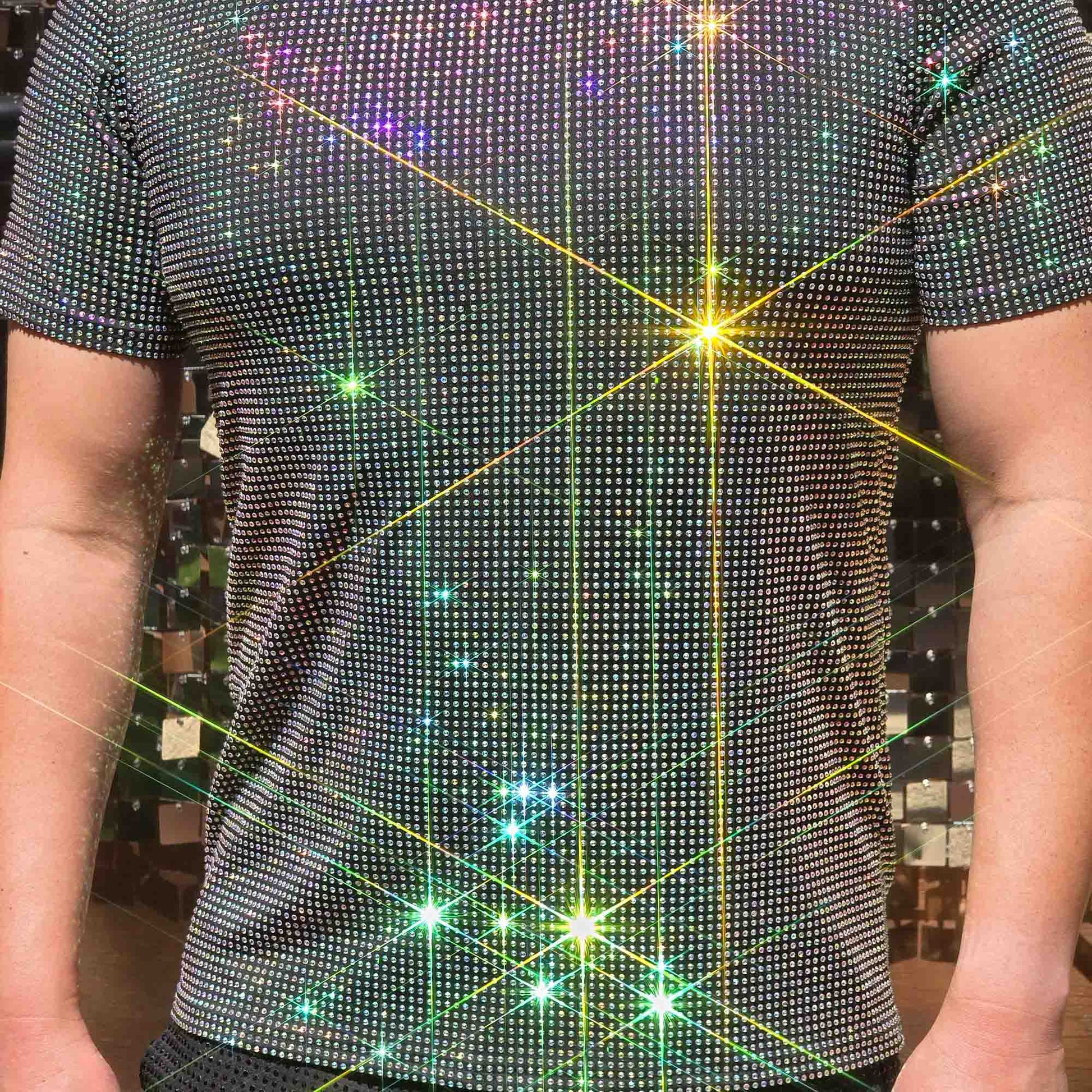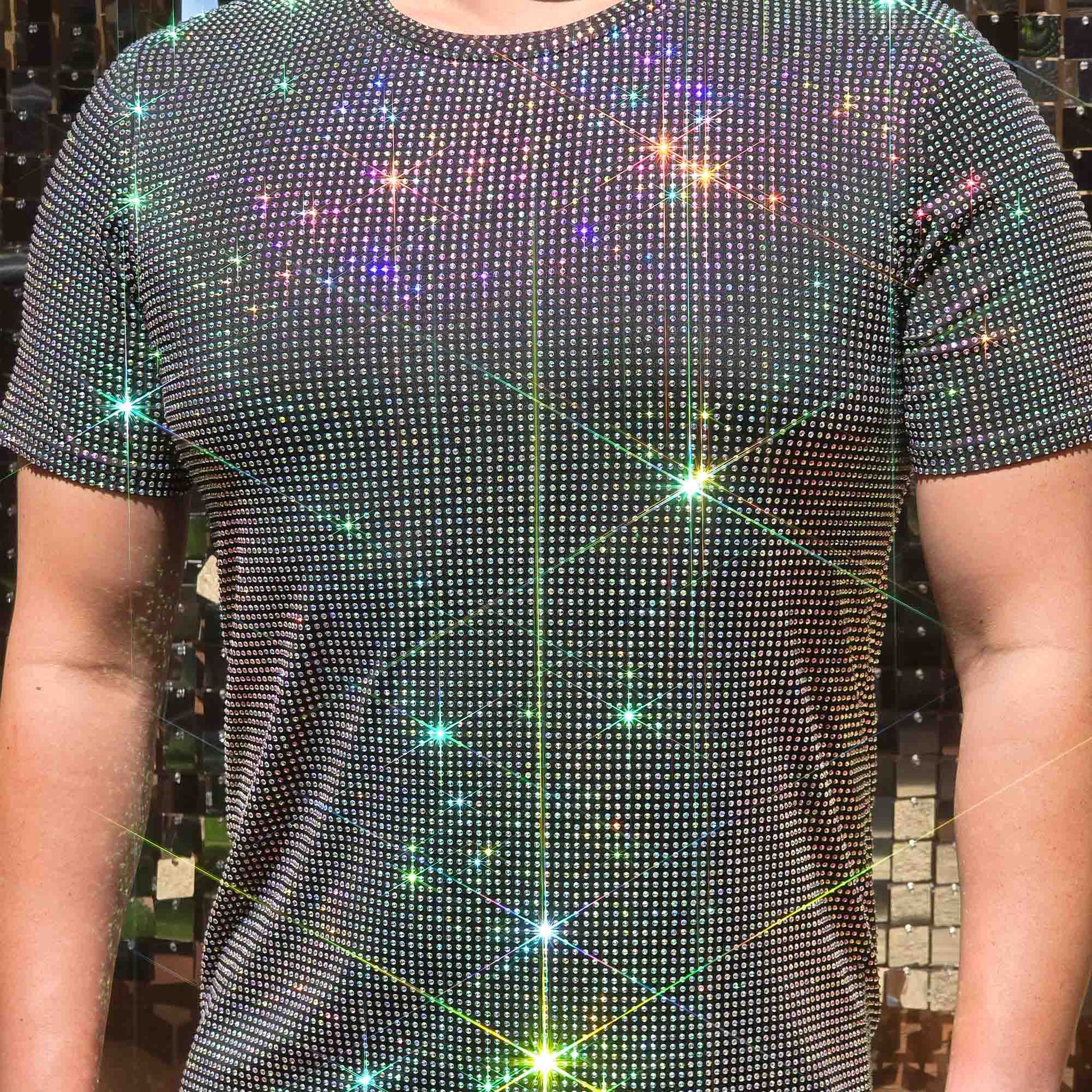 Step into the world of high fashion with our handmade, distinctive T-shirt, adorned with captivating Clear AB rhinestones on black fabric. Every detail of this T-shirt exudes luxury while ensuring unmatched comfort, making it perfect for making a lasting impression. Bathed in light, it glistens with countless gems, creating a spectacle that photographs and films can't fully capture. With its unforgettable Clear AB crystals on black fabric, this T-shirt is guaranteed to spark conversations and turn heads.