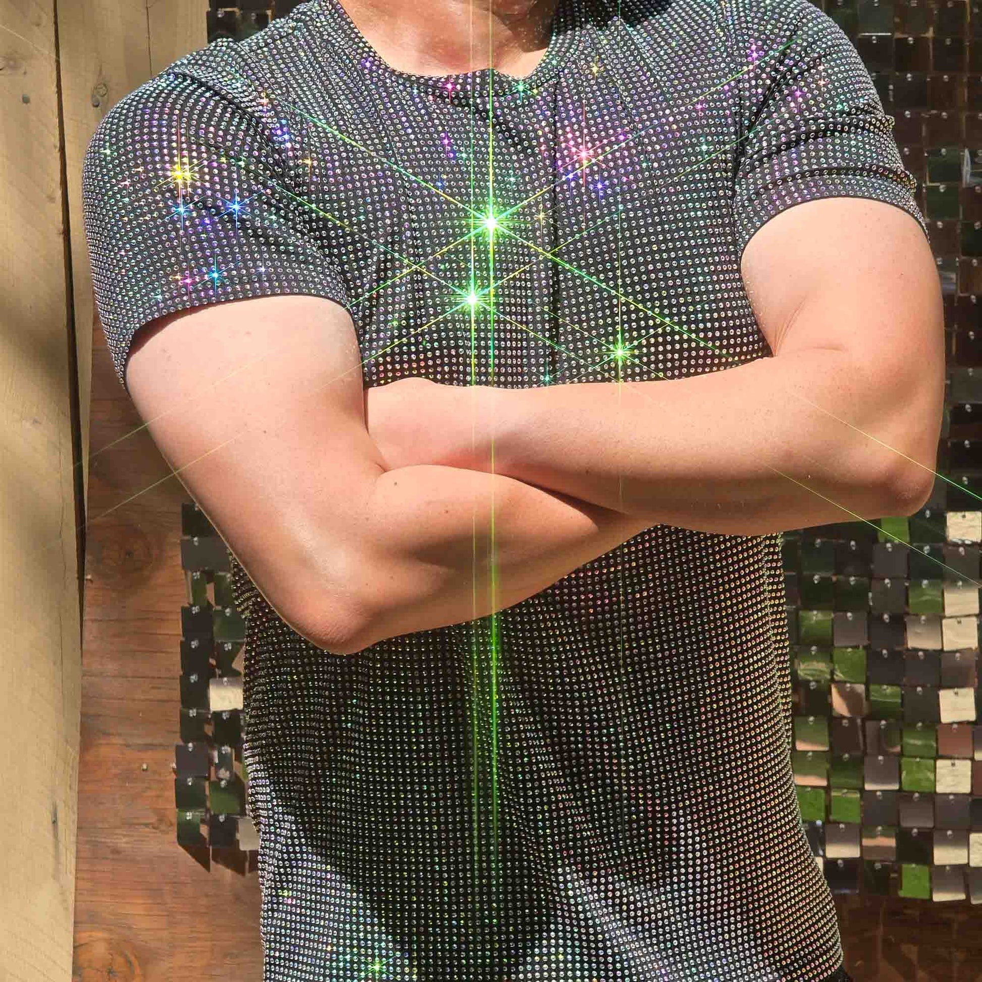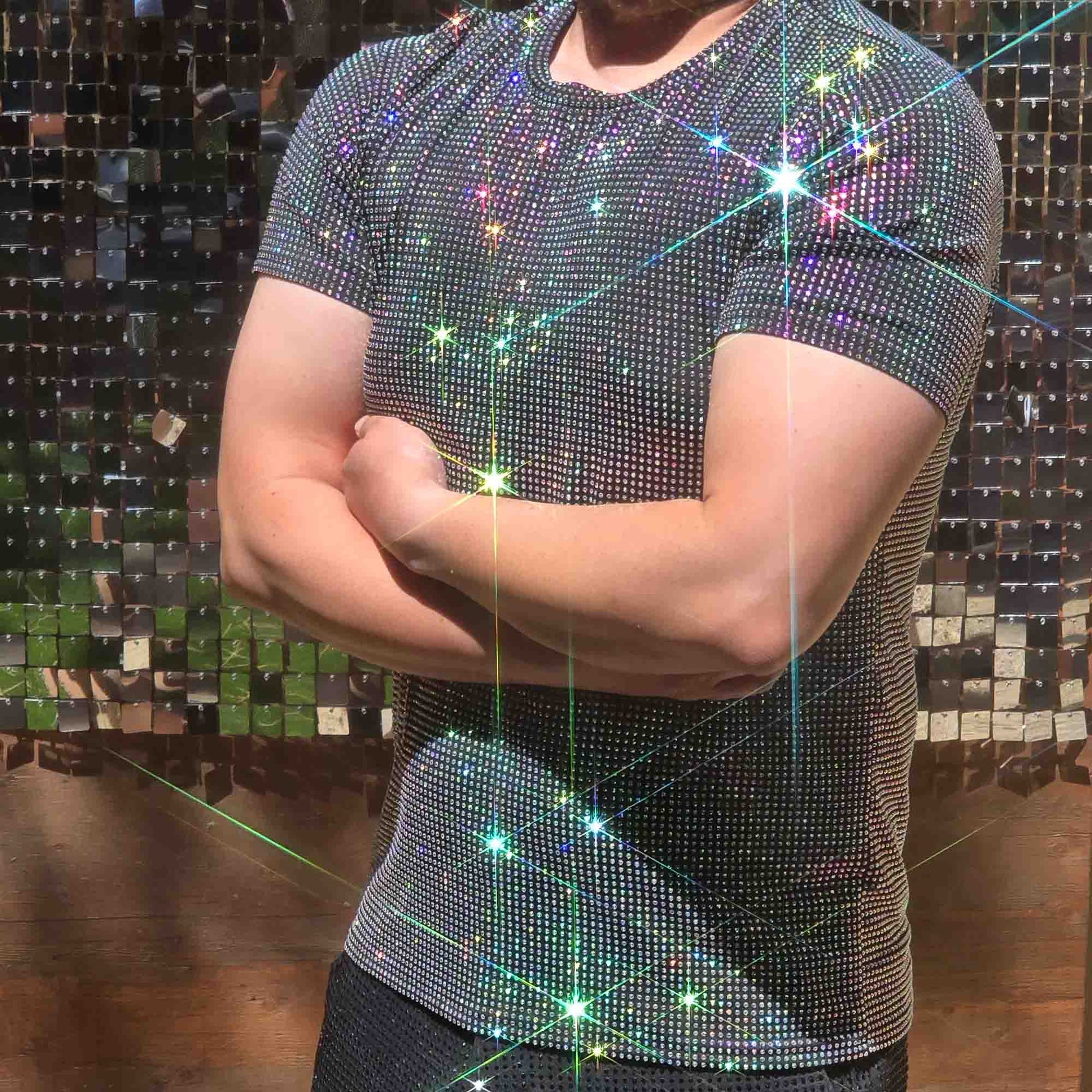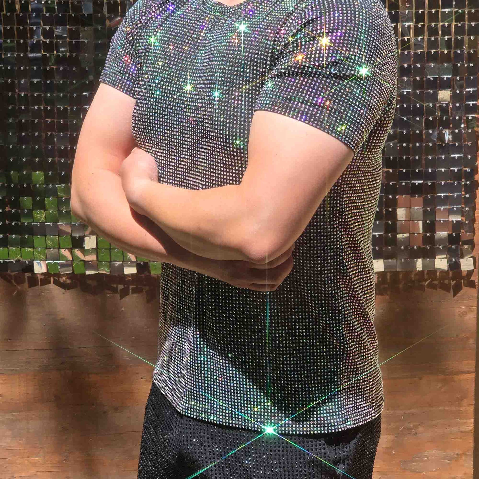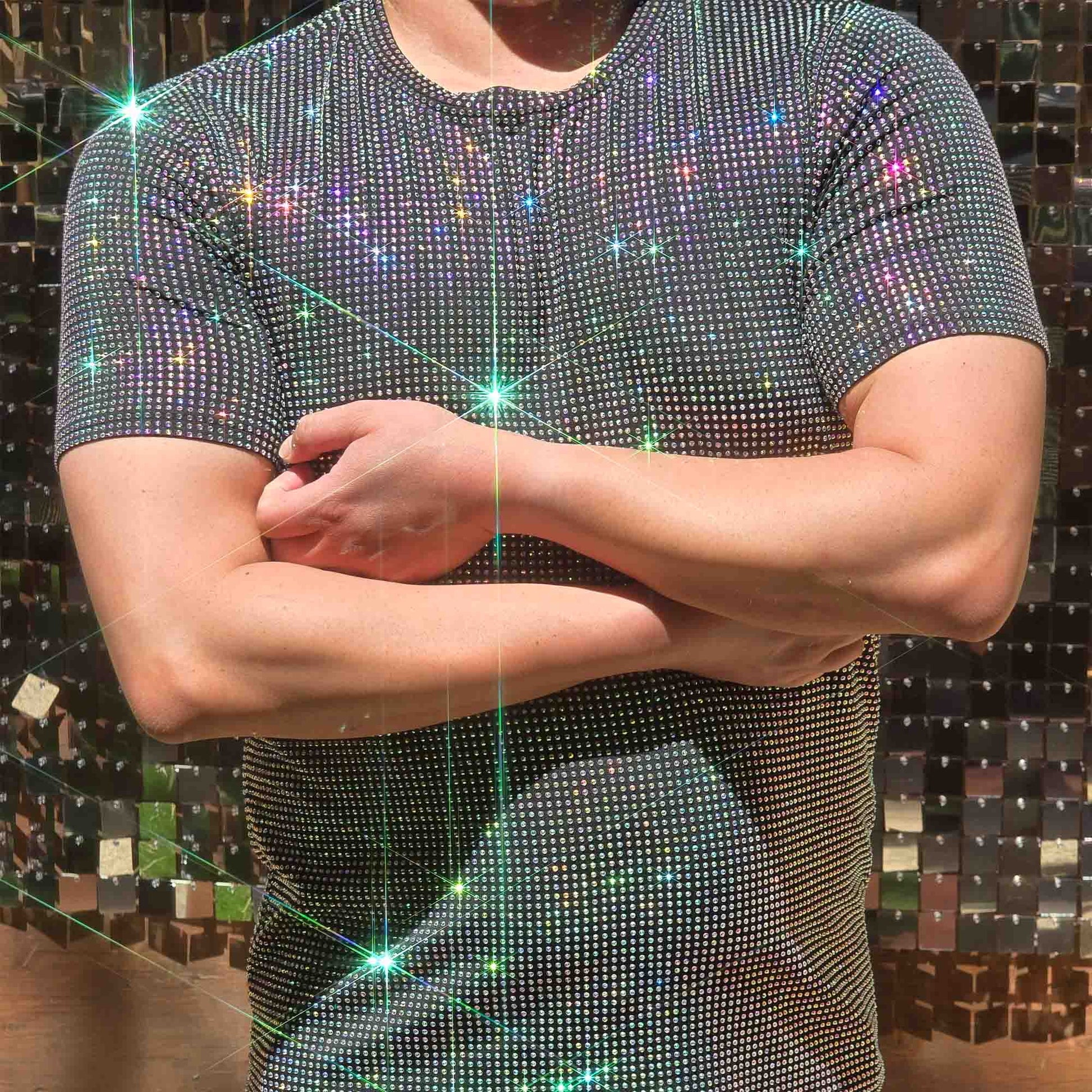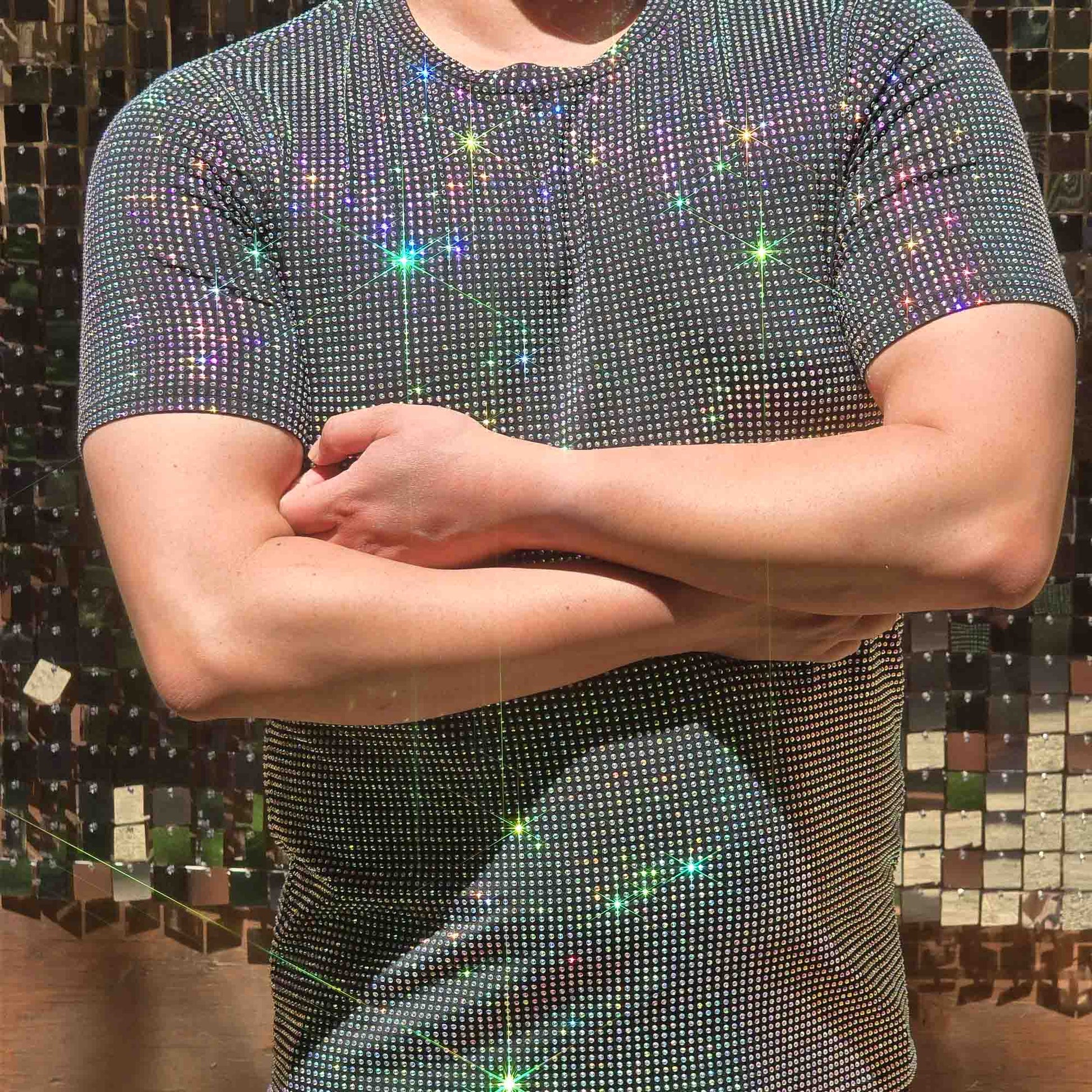 Step into the world of high fashion with our handmade, distinctive T-shirt, adorned with captivating Clear AB rhinestones on black fabric. Every detail of this T-shirt exudes luxury while ensuring unmatched comfort, making it perfect for making a lasting impression. Bathed in light, it glistens with countless gems, creating a spectacle that photographs and films can't fully capture. With its unforgettable Clear AB crystals on black fabric, this T-shirt is guaranteed to spark conversations and turn heads.
